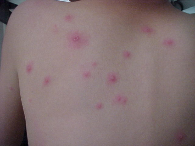 初起为散在性红色小丘疹,数小时至一日后变成绿豆大小的水疱,周绕红晕。水疱初呈清澈透明珠状,壁薄易破,伴瘙痒。经2--3天而干燥结痂,以后脱痂而愈,。发病3--5天内皮疹陆续分批发生,故同时可见丘疹、水痘、结痂等不同时期的皮损,这是水痘的重要临床特征。
