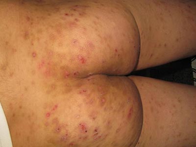 2、除了隧道外,疥疮结节出现后,疥疮的红斑、丘疹等症状一般都已经发展了许久,其数量通常都很多,不规律的分布在疥螨活动的区域。
