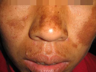 4、脸部长有褐色的密密麻麻的斑点,遮挡干净白皙的皮肤亮泽,色斑出现后,周围肌肤就会以暗黄色为主,整个面貌显得枯槁、没有精神,严重影响面貌形象,这样给患者心理带来阴影,渐渐失去自信。