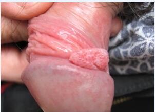 菜花型尖锐湿疣多发部位:由于此型损害常发生于男性包皮内侧面、冠状沟、尿道口和女性小阴唇内侧、阴道口、后联合、阴道壁及肛门等湿润部位,故损害较柔软,表面潮湿,但若其损害发生在较干燥的皮肤粘膜上则可质地较硬,且损害颜色可呈暗红色或接近皮肤粘膜色。