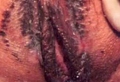 女性生殖器疱疹大多发生于大小阴唇、阴蒂或宫颈处,就会出现多数的粟粒大丘疹、水疱,也会融合成片状。2到4天进入糜烂或溃疡后,自觉灼痒,疼痛。侵袭和尿道上皮损伤疼痛,排尿困难,尿道口有粘液分泌。7至10天当病变达到高峰,然后逐渐淡出疮痂病,通常需要18到21天,皮损基本消退,正常上皮生长。