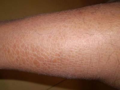 **是皮肤可呈现鱼鳞或蛇皮样,一般为菱形或多角形,中间附着,边缘上翘,常见在小腿上。鳞屑一般为白色,皮肤干燥 ,严重时候可伴有瘙痒感。