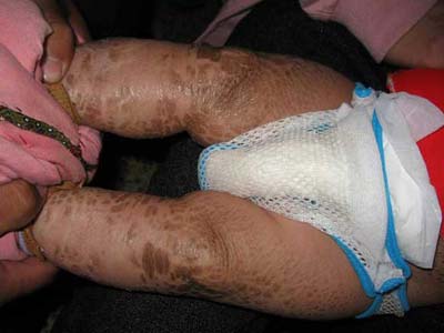 先天性红皮病型鱼鳞病在新生儿一出生时就会表现很明显,全身出现铠甲样多层鳞屑,鳞屑脱落后出现湿润面,还会慢慢出现木小不等的松弛性水疤或大疤。