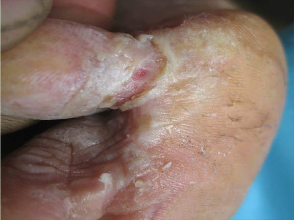 5、脚气临床表现为脚趾间起水疱、脱皮或皮肤发白湿软,也可出现糜烂或皮肤增厚、粗糙、开裂,并可蔓延至足跖及边缘,剧痒。可伴局部化脓、红肿、疼痛,腹股沟淋巴结肿大,甚至形成小腿丹毒及蜂窝组织炎等继发感染。