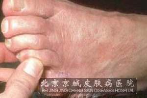 3、鳞屑角化型:这种类型的可以表现为足底、足缘、足跟部皮肤脚趾增厚,并且可出现粗糙、脱屑的症状。冬天的趾缝间的皮肤还可以发生裂隙,而夏季产生水疱。本病还可因搔抓而导致继发性感染,并且可以继发脓包疮、淋巴管炎、淋巴结炎等疾病。