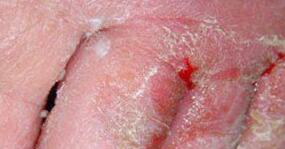 角化增厚型:多由水疱鳞屑型发展而成,患者有多年病史,常已累及双手,皮损无明显的水疱或环形脱屑,掌面弥漫性发红增厚,皮纹加深,皮肤粗糙,干而有脱屑,冬季易皲裂,裂口深而有出血,疼痛难忍。